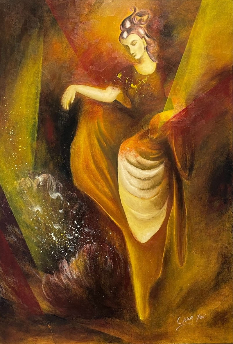這幅作品是思念母親的故事,母親在幾年前去逝,每年的母親節都會想起心中的回憶,最深沉的痛,我將觀音比喩為母親,觀音下座的牡丹比喩為自己,母親永遠都在觀照著自己的孩子,無論牠在何處,心永遠掛念著自己的孩子. 多層次光源得疊加是思念的記憶
